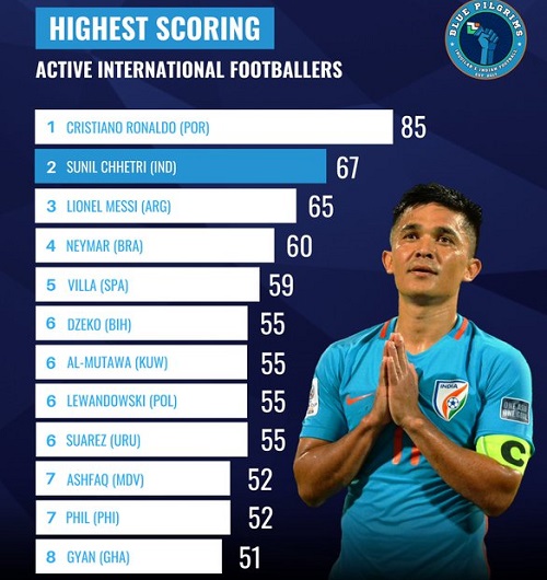 Như vậy, nếu tính số cầu thủ vẫn đang thi đấu, Sunil Chhetri là chân sút ghi nhiều bàn thắng nhất cho ĐTQG, chỉ sau Cristiano Ronaldo (85 bàn).