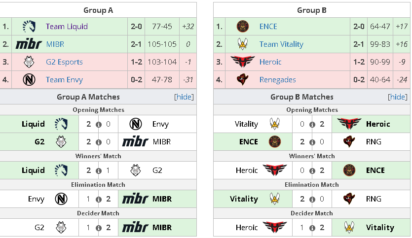 G2 gặp một MiBR không có Coldzera, đã dễ dàng có chiến thắng với tỉ số 2-0. Nhưng khi gặp Liquid với phong độ huỷ diệt, 'rạp xiếc' của KennyS cùng các đồng đội dù đã vùng vẫy nhưng vẫn phải chấp nhận thua 1-2 và sẽ phải bắn Decider Match.