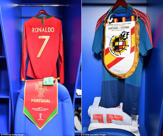 Ngăn đựng đồ của Cristiano Ronaldo và Sergio Ramos trước trận đấu giữa Bồ Đào Nha và Tây Ban Nha (rạng sáng 16/6).