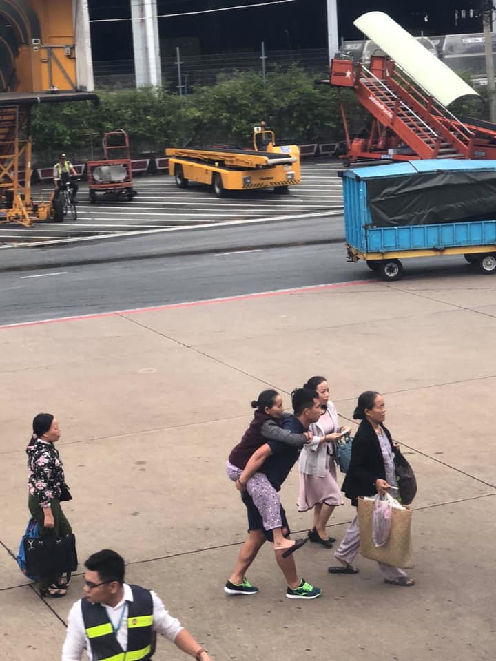 Hậu vệ Hoàng Quảng cõng bà cụ ở sân bay.