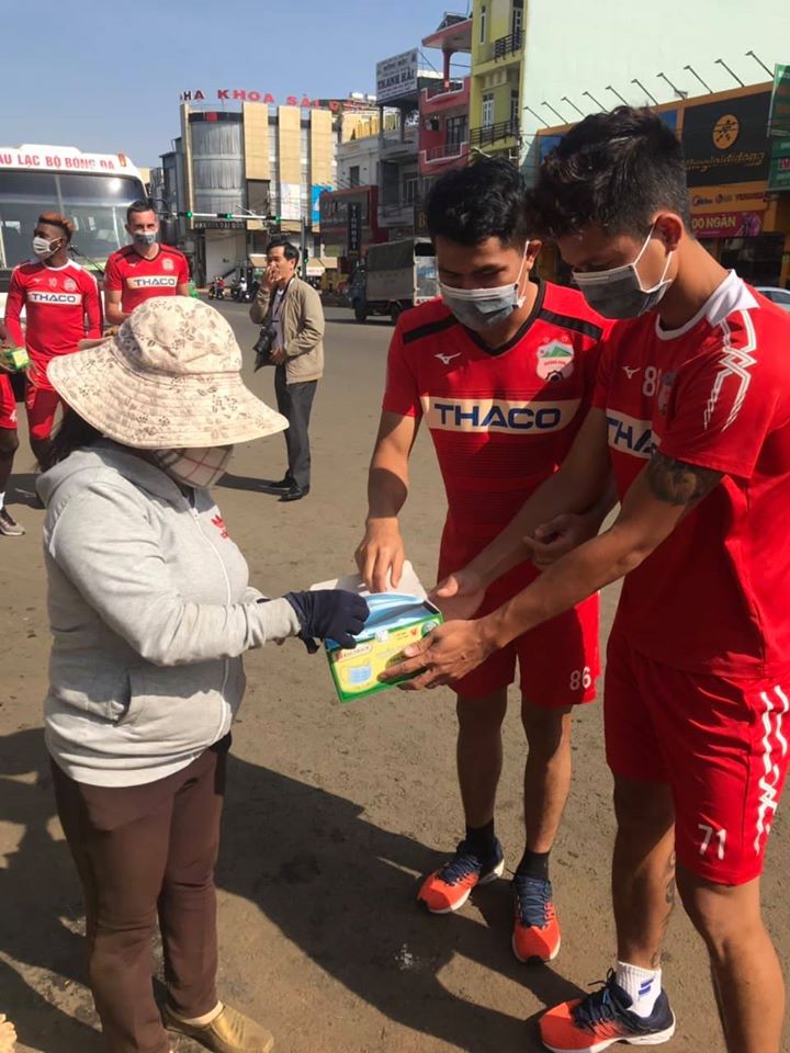 Hình ảnh cầu thủ HAGL đi phát khẩu trang phòng ngừa virus Corona là câu chuyện đẹp của bóng đá Việt Nam. Ảnh: CLB HAGL