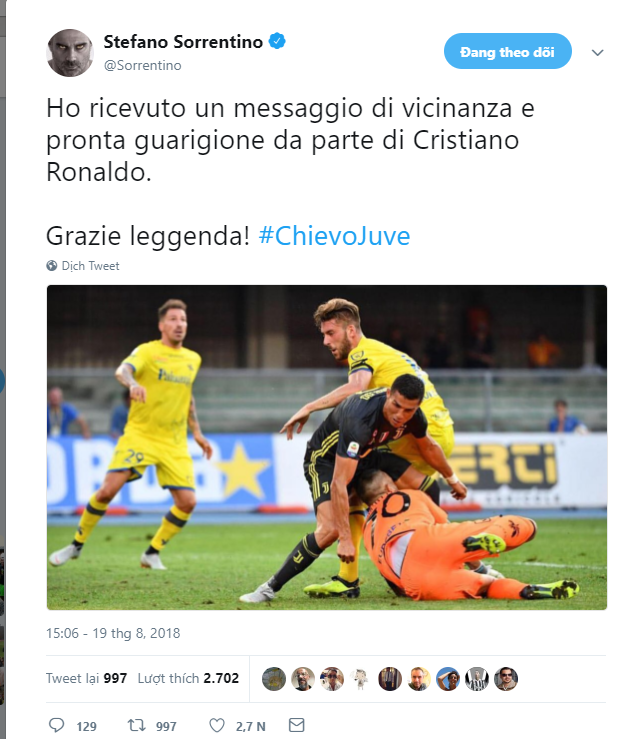 Ronaldo dường như cũng thể hiện được sự chuyên nghiệp bằng việc nhanh chóng liên lạc, hỏi thăm Sorrentino. Chính điều này đã khiến thủ môn người Italia xúc động và đưa ra lời cảm ơn nhằm đáp lại hành động thân thiện từ cầu thủ CLB Juventus.