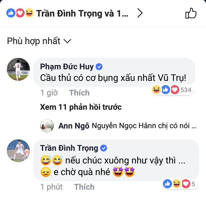Ngay bên dưới bài đăng của Quế Ngọc Hải, Phạm Đức Huy cũng góp vui với comment dìm hàng “cầu thủ có cơ bụng xấu nhất vũ trụ”.