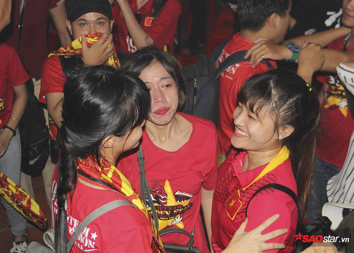 Một CĐV nữ khác lau nước mắt liên tục vì hạnh phúc.