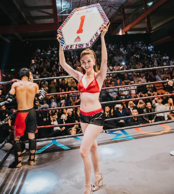 Trong giải đâu đó, Ngọc Trinh hóa thân thành Ring Girl với bộ đồ cắt xẻ vô cùng nóng bỏng và quyến rũ khiến cho đấng mày râu nào cũng sẵn sàng bỏ hầu bao mua vé để ngắm nhìn.