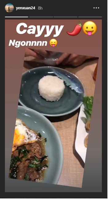 Trong một bài đăng mới nhất trên story instagram, Yến Xuân cũng đã “lấp ló” những hình ảnh cùng Lâm “Tây”. Cụ thể, video được “nữ hoàng Gymmer” quay lại những món ăn được bạn trai dẫn đi, trong đó có món Tom Yum - đặc sản nổi tiếng nhất xứ sở Chùa Vàng. Những phỏng đoán đó càng có cơ sở khi caption “Cay, ngon” là những đặc trưng của món Tom Yum, cùng với đó là đôi bàn tay “gân guốc” của chàng thủ môn gốc Việt này.