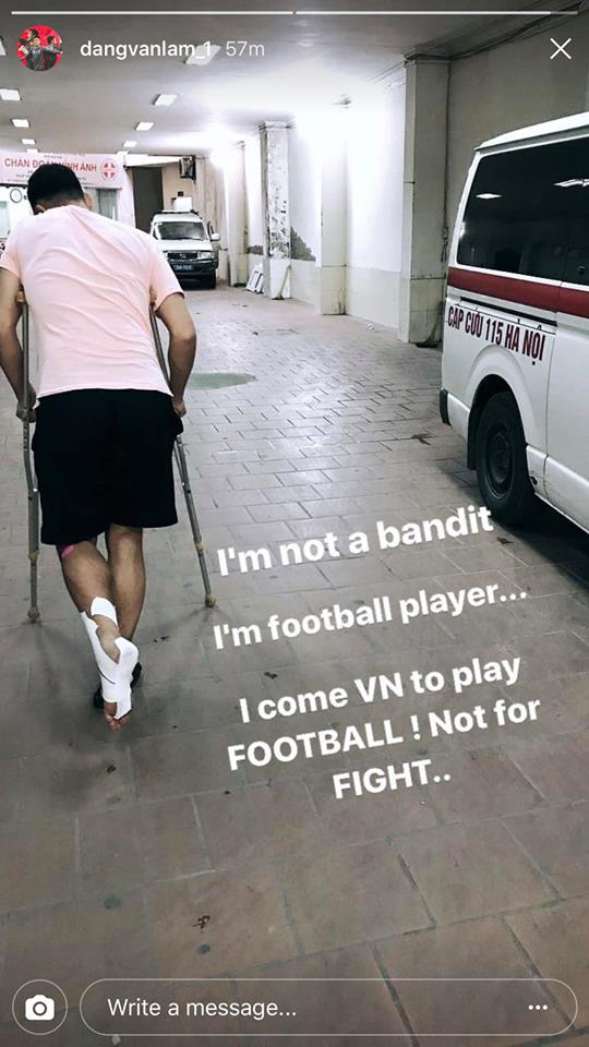 Sau khi bị đàn anh dọa chém dẫn đến chấn thương, Văn Lâm đăng ảnh với dòng chia sẻ: “Tôi về Việt Nam để đá bóng chứ không phải để đánh nhau”.