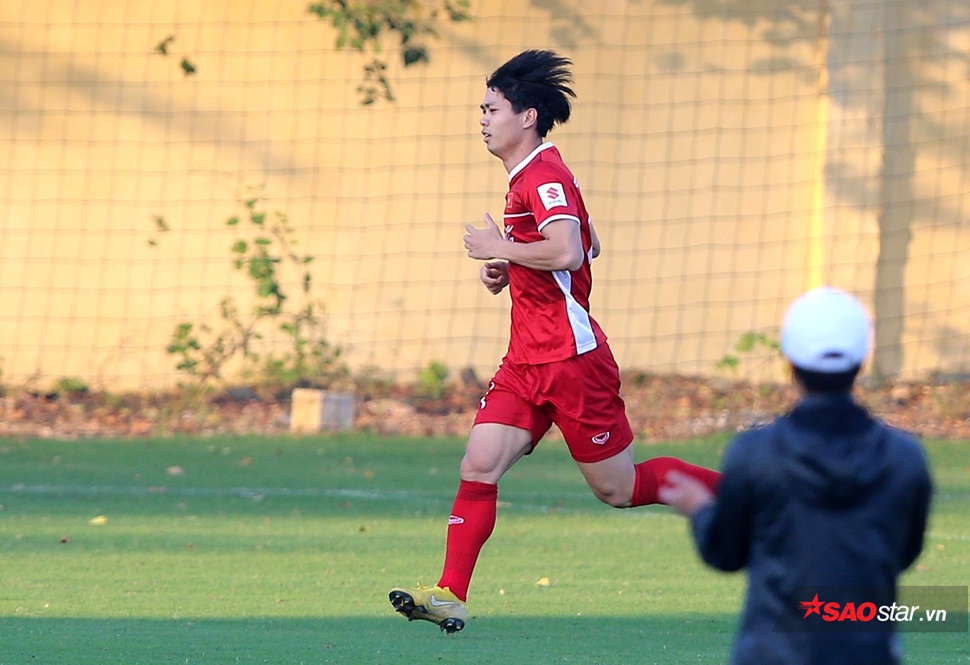 Trong buổi tập ngày hôm qua, HLV Park Hang Seo bố trí đội hình gồm: Thủ môn Đặng Văn Lâm, hàng thủ gồm: Duy Mạnh, Đình Trọng, Quế Ngọc Hải. Hai tiền vệ cánh: Văn Hậu, Trọng Hoàng, hai tiền vệ trung tâm: Quang Hải, Xuân Trường. Ba tiền đạo: Văn Quyết, Anh Đức, Công Phượng.
