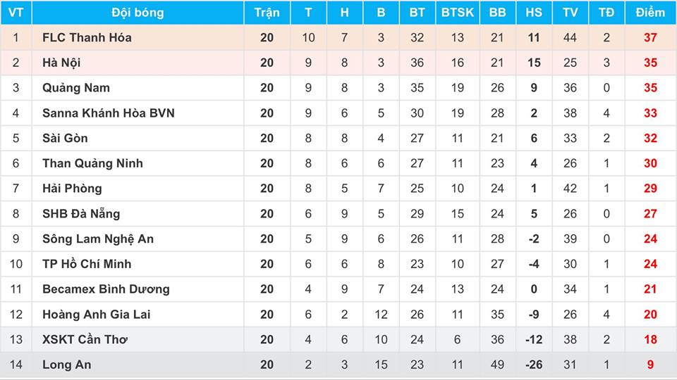 Bảng xếp hạng V.League 2017 sau vòng 20: