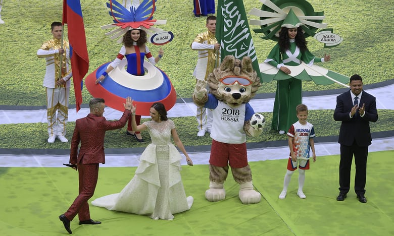 Màn song ca của Williams với nữ ca sĩ opera của nước chủ nhà Nga, Aida Garifullina. Bên cạnh họ là linh vật Zabivaka trong mùa World Cup năm nay. Trong bài diễn văn khai mạc, Tổng thống Nga Vladimir Putin bày tỏ sự vui mừng với lần đầu tiên tổ chức một vòng chung kết World Cup. Ông gửi lời cảm ơn tới FIFA và người hâm mộ toàn thế giới đã tới Nga trong hè 2018. Ông cũng hy vọng kỳ World Cup đầu tiên trên đất Nga sẽ đặt dấu mốc lịch sử cho nền thể thao xứ bạch dương.