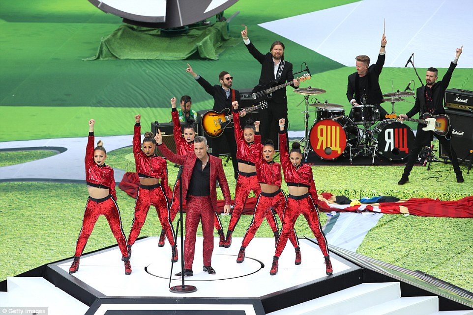 Ca sĩ nhạc pop người Anh Robbie Williams trình diễn 3 bài hát trong lễ khai mạc World Cup 2018. Williams làm nóng bầu không khí của sân Luzhniki bằng ca khúc Let Me Entertain You.