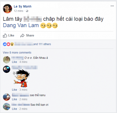 Cũng vì vụ việc này mà ban lãnh đạo CLB Hải Phòng đã ra quyết định sa thải Lê Sỹ Mạnh. Cựu tiền đạo ĐTVN vẫn tiếp tục đăng trên facebook cá nhân dòng trạng thái mang tính kích động kiểu bất chấp dư luận và tag cả facebook Đặng Văn Lâm: “Lâm tây *** chấp hết các loại báo đây”.