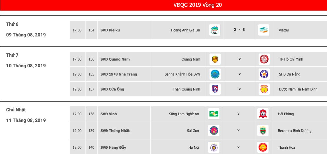 Lịch thi đấu V.League vòng 20.