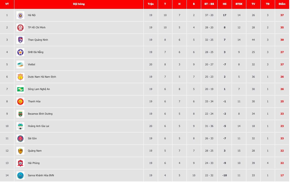 BXH V.League thời điểm hiện tại.