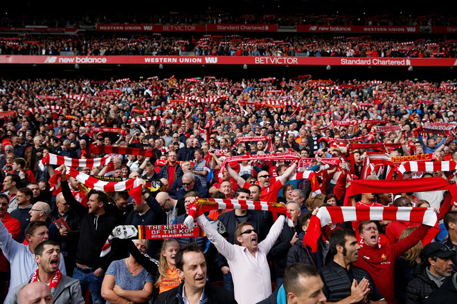 Không khí cuồng nhiệt trên khán đài sân Anfield.