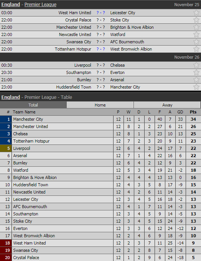 Lịch thi đấu vòng 13 Premier League (giờ Việt Nam) và BXH sau vòng 12.