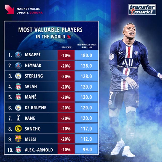 Đối với những cầu trẻ (sinh từ năm 1998 trở đi) thì mức sụt giảm chỉ là 10%. Điều này đồng nghĩa với việc cầu thủ duy nhất cán mốc 200 triệu euro là Kylian Mbappe chỉ còn được định giá 180 triệu euro.