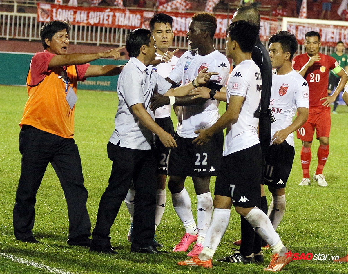 Ông Võ Thành Nhiệm và toàn đội Long An phản ứng trọng tài ở sân Thống Nhất.