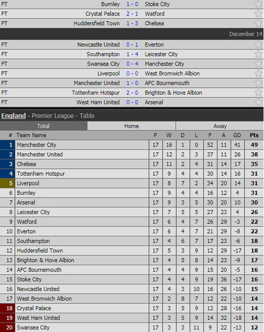 Kết quả và bảng xếp hạng Premier League sau vòng 17.