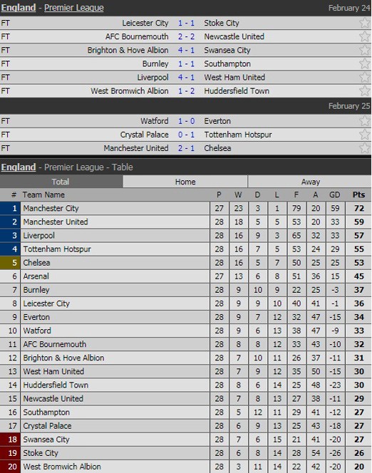 Kết quả và BXH Ngoại hạng Anh tạm thời sau vòng 28.