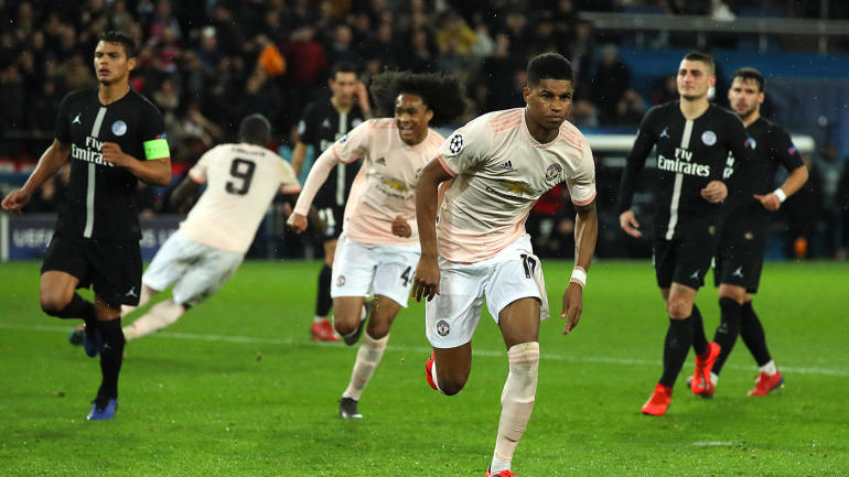 PARIS, FRANCE - MARCH 06: Marcus Rashford of Manchester United celebrates scoring a goal to make the score 1-3 during the UEFA Champions League Round of 16 Second Leg match between Paris Saint-Germain and Manchester United at Parc des Princes on March 6, 2019 in Paris, France. (Photo by Matthew Ashton - AMA/Getty Images)