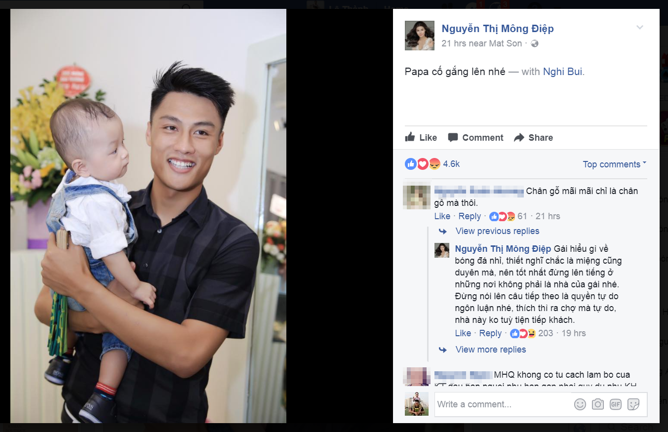 Tối qua, Kỳ Hân cho đăng lên tấm ảnh Mạc Hồng Quân rạng rỡ ôm con trai, kèm lời bình: “Papa cố gắng lên nhé”. Dòng trạng thái của Kỳ Hân được cho là để động viên chồng khi anh được triệu tập lại đội tuyển quốc gia sau 1 thời gian dài vắng bóng.