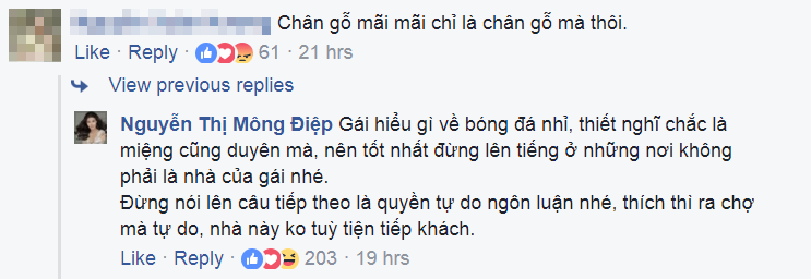 Cụ thể, khi thấy người dùng có tên N.X.H gọi chồng là “chân gỗ”, Kỳ Hân lập tức bình luận: “tốt nhất đừng lên tiếng ở những nơi không phải là nhà của gái”. Lời phản pháo của Kỳ Hân sau đó thu hút tới hơn 200 like.
