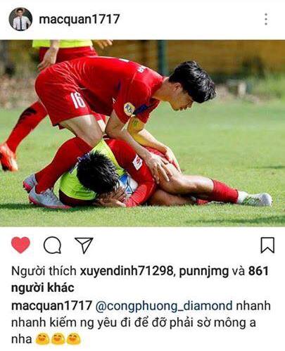 Kèm theo đó, chân sút của CLB Than Quảng Ninh còn viết dòng bình luận đầy hài hước: “Nhanh nhanh kiếm người yêu đi để đỡ phải sờ mông anh nha”. Mạc Hồng Quân còn đánh dấu tài khoản của Công Phượng vào bài đăng của mình.