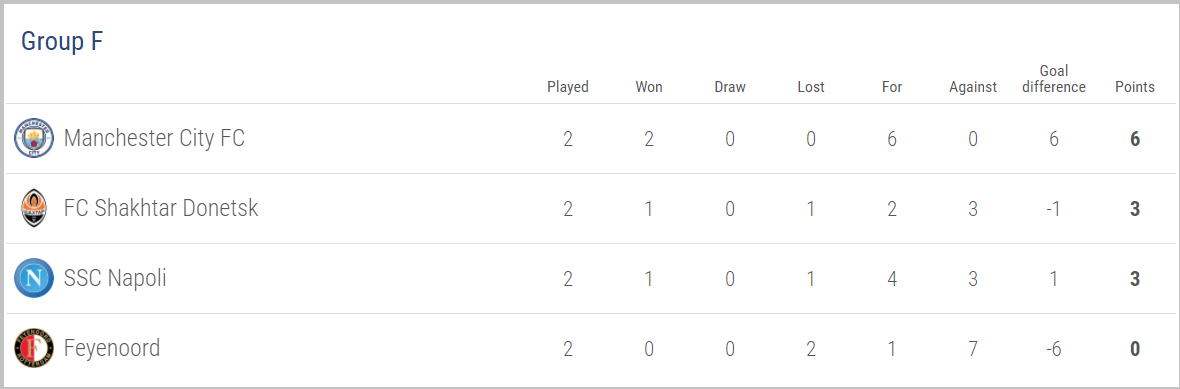 Với chiến thắng này, Man City tiếp tục xây chắc ngôi đầu khi hơn chính Shakhtar Donetsk 3 điểm. Ở trận đấu còn lại, SSC Napoli vượt qua Feyenoord để đánh chiếm vị trí thứ 2 bảng F.