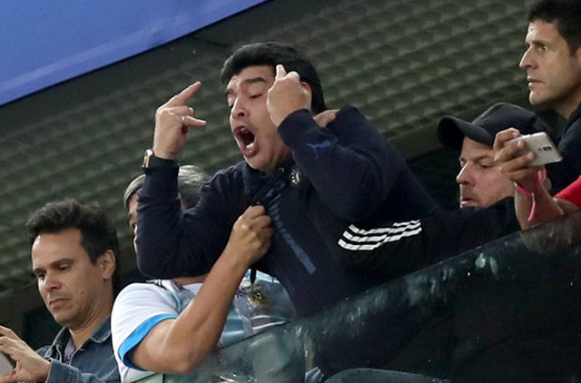 Ở dưới sân, các cầu thủ Argentina đã khiến nhiều người phải trầm trồ thán phục khi thi đấu hết sức thăng hoa, còn trên khán đài của sân Krestovsky thì huyền thoại bóng đá nước này là Diego Maradona lại khiến không ít người cảm thấy bức xúc bởi có những hành động phản cảm.