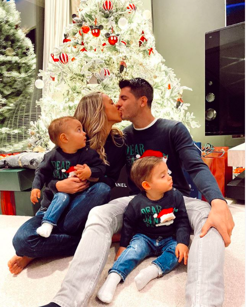 Vợ chồng tiền đạo Morata khoá môi tình tứ bên 2 quý tử.