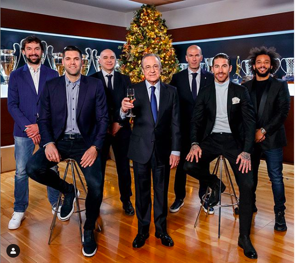 Dàn sao CLB Real Madrid quây quần bên ngài chủ tịch Florentino Perez.