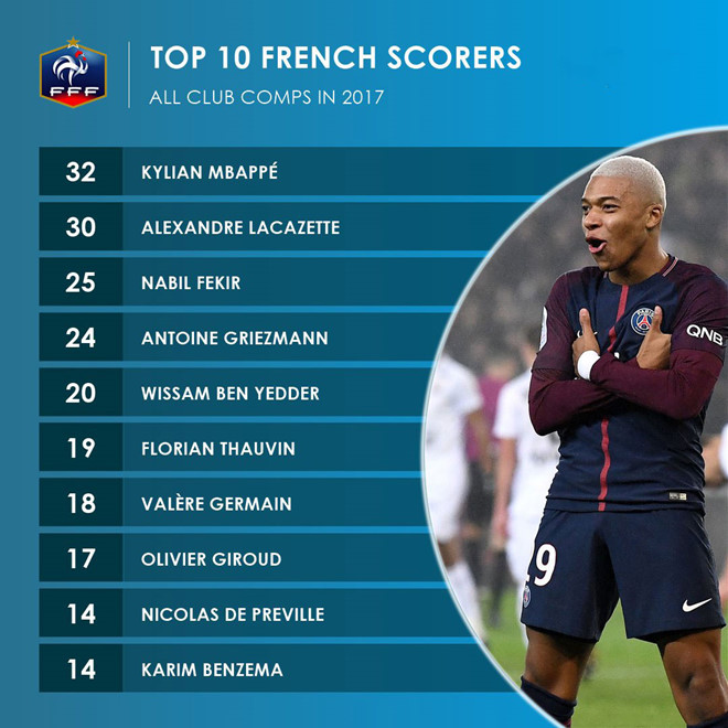 Bên cạnh đó, Mbappe chính là cầu thủ người Pháp ghi nhiều bàn thắng nhất năm 2017 tại 5 giải vô địch quốc gia hàng đầu châu Âu.