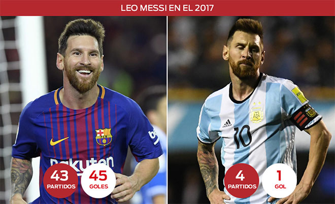 Những bàn thắng dường như đang quay lưng lại với Lionel Messi mỗi khi anh khoác áo tuyển Argentina. Bằng chứng là trong năm 2017, anh đá 4 trận cho ĐTQG mà mới ghi đúng 1 bàn. Ngược lại, anh ghi đến 45 bàn trong 43 trận thi đấu cho Barcelona trong năm nay.
