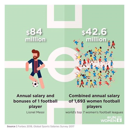 Tuyên bố này được cơ quan phụ nữ Liên hợp quốc đưa ra cùng những số liệu cụ thể về thu nhập của ngôi sao đang chơi cho Barca, Messi hiện đang hưởng số tiền lương lên tới 83 triệu Euro mỗi năm. Con số này gấp đôi tổng thu nhập của 1700 cầu thủ nữ đang thi đấu ở các giải VĐQG hàng đầu châu Âu.