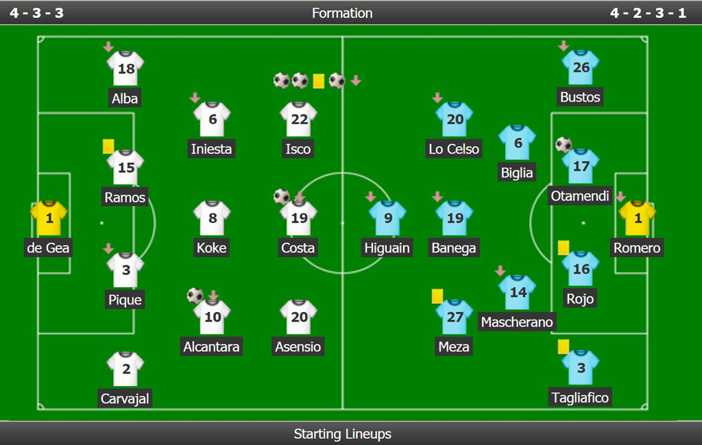 Từ phút 52 đến phút 74, lưới Argentina rung lên đến 4 lần. Isco tỏa sáng với một hat-trick. Thiago và Aspas cũng góp vui với mỗi người một bàn.