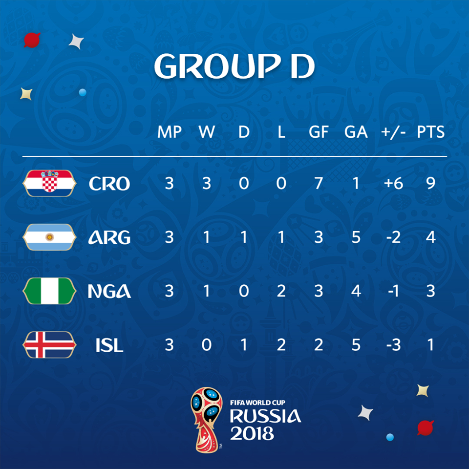 Với cái bất ngờ ở loạt cuối, Argentina hạ Nigeria 2-1, còn Croatia thắng Iceland 2-1, hai tấm vé đi tiếp được trao cho Croatia và Argentina. Đội bóng xứ Tango xếp thứ nhì nên gặp Pháp (nhất bảng C) ở vòng 1/8, còn đội đầu bảng Croatia đụng Đan Mạch.