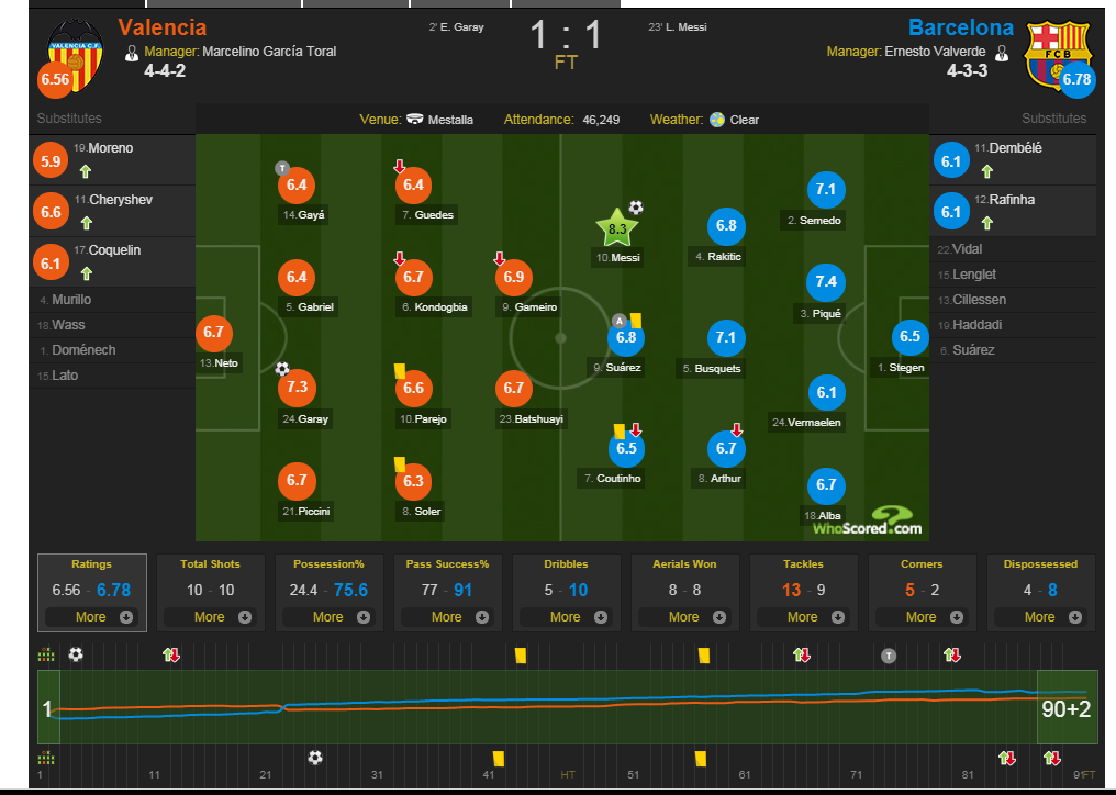 Mặc dù vậy, lối đá phòng ngự cực kỳ kín kẽ mà CLB Valencia sử dụng hoàn toàn vô hiệu hóa những cầu thủ tấn công bên phía Barca. Họ chủ động nhường quyền kiểm soát bóng cho các học trò HLV Valverde đến hơn 75% và chơi kín kẽ bên phần sân nhà khiến Los Blaugrana không tài nào có thêm những pha bóng nguy hiểm.