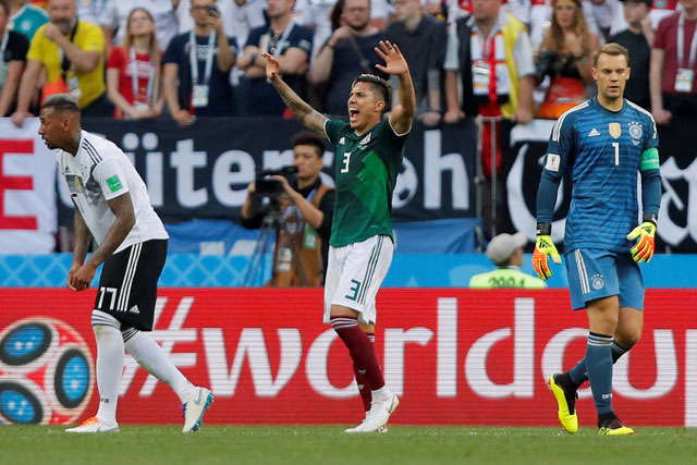 Hậu vệ Carlos Salcedo của Mexico ăn mừng chiến thắng khi đứng giữa thủ thành Manuel Neuer và hậu vệ Jerome Boateng bên phía ĐT Đức.