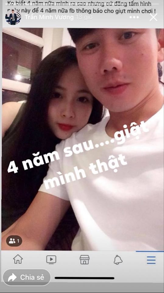 “Không biết 4 năm nữa ra sao nhưng cứ đăng tấm hình này để 4 năm nữa Facebook thông báo cho giật mình chơi”, Minh Vương viết caption cùng bức ảnh thân mật với bạn gái cũ cách đây 4 năm.