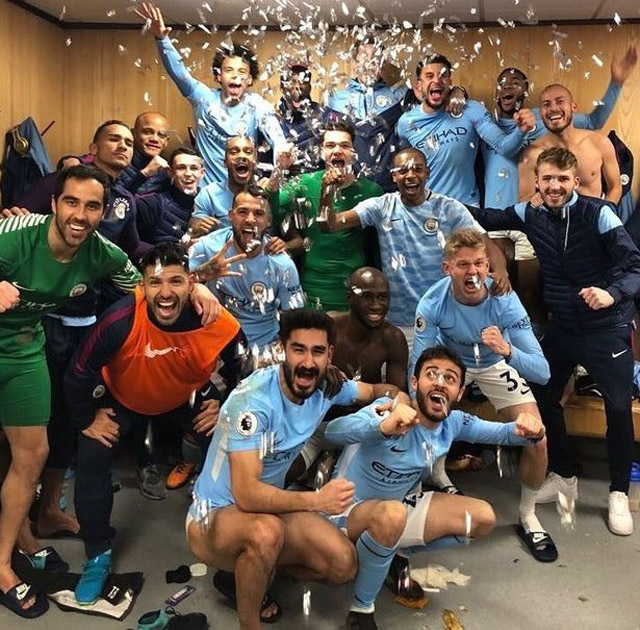Các cầu thủ Man City ăn mừng trong phòng thay đồ sân Old Trafford.