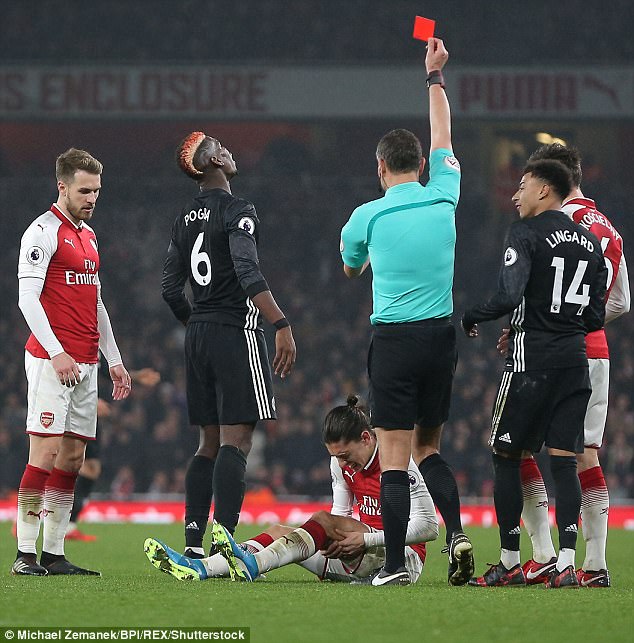 Pogba lĩnh thẻ đỏ trực tiếp ở phút 74 sau pha vào bóng có phần ác ý với Bellerin. Việc tiền vệ người Pháp bị đuổi khiến chiến thắng của Man Utd kém vui, nhất là trong bối cảnh ở vòng tới đội bóng của Mourinho phải đối đầu với kình địch cùng thành phố.