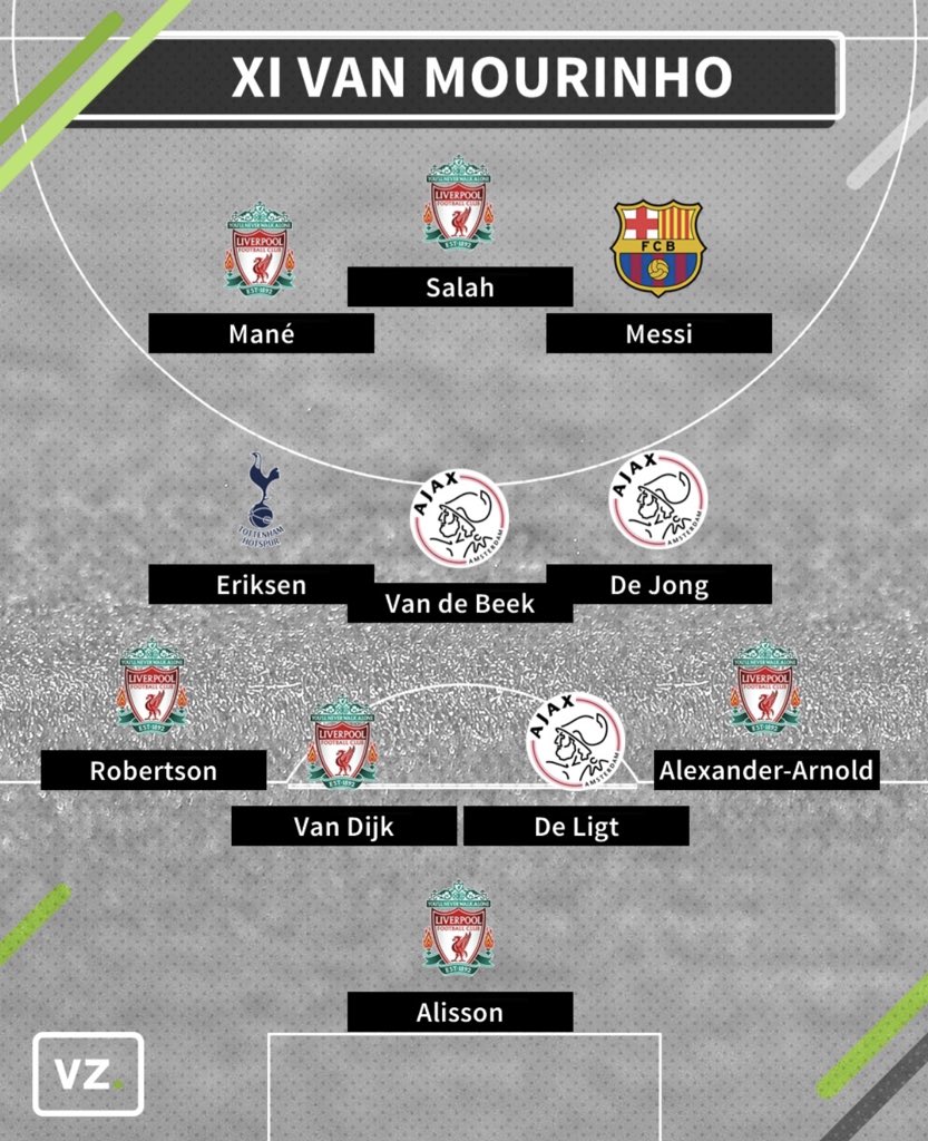 Hai ngôi sao của Liverppool được Mourinho lựa chọn tiếp theo là Sadio Mane và Mo Salah. Trong 5 vị trí khác, Ajax chiếm ba người bao gồm trung vệ De Ligt, tiền vệ De Jong và van de Beek. Tottenham có một người duy nhất là Christian Eriksen. Người cuối cùng được chọn là Messi của Barca.