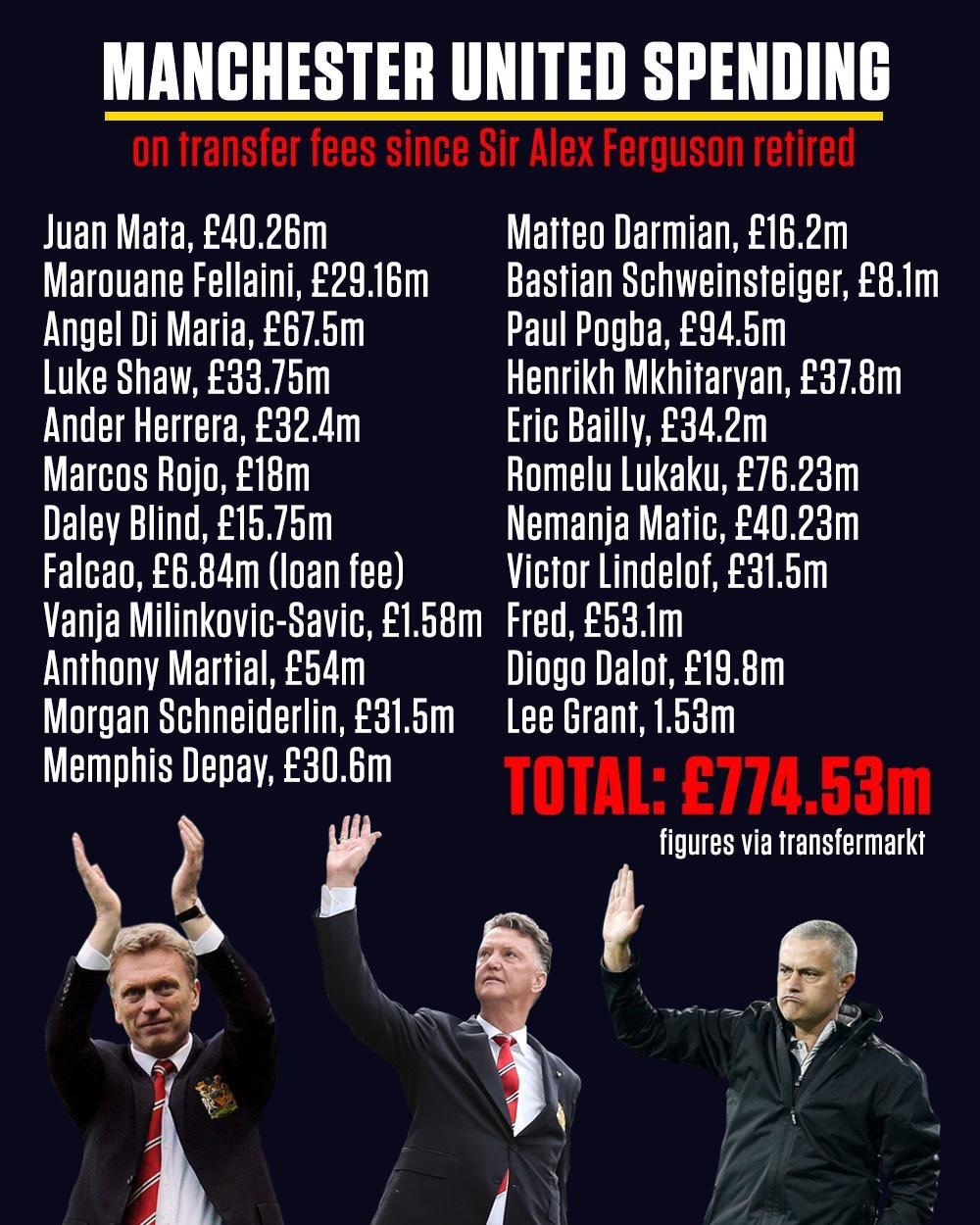 Manchester United đã tiêu 775,53 triệu Euro chỉ sau 3 đời HLV.