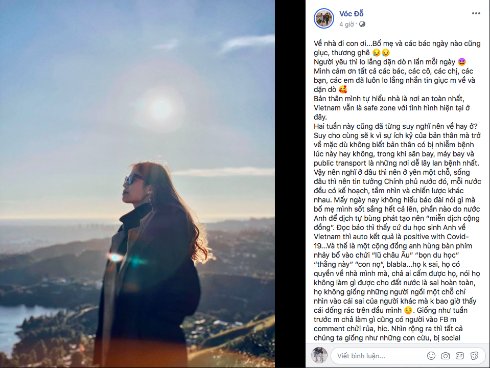 “Mấy ngày nay không hiểu báo đài nói gì mà bố mẹ mình sốt sắng hết cả lên, phần nào do nước Anh để dịch tự bùng phát tạo nên “miễn dịch cộng đồng”. Đọc báo thì thấy cứ du học sinh Anh về Vietnam thì tự động kết quả là dương tính với Covid-19… Và thế là một cộng đồng anh hùng bàn phím nhảy bổ vào chửi “lũ châu Âu” “bọn du học”, “thằng này”, “con nọ”, blabla… Họ không sai, họ có quyền về nhà mình mà, chả ai cấm được họ, nói họ không làm gì được cho đất nước là sai hoàn toàn, họ không giống những người ngồi một chỗ chỉ nhìn vào cái sai của người khác mà không bao giờ thấy cái đống rác trên đầu mình….”, cô viết tiếp.