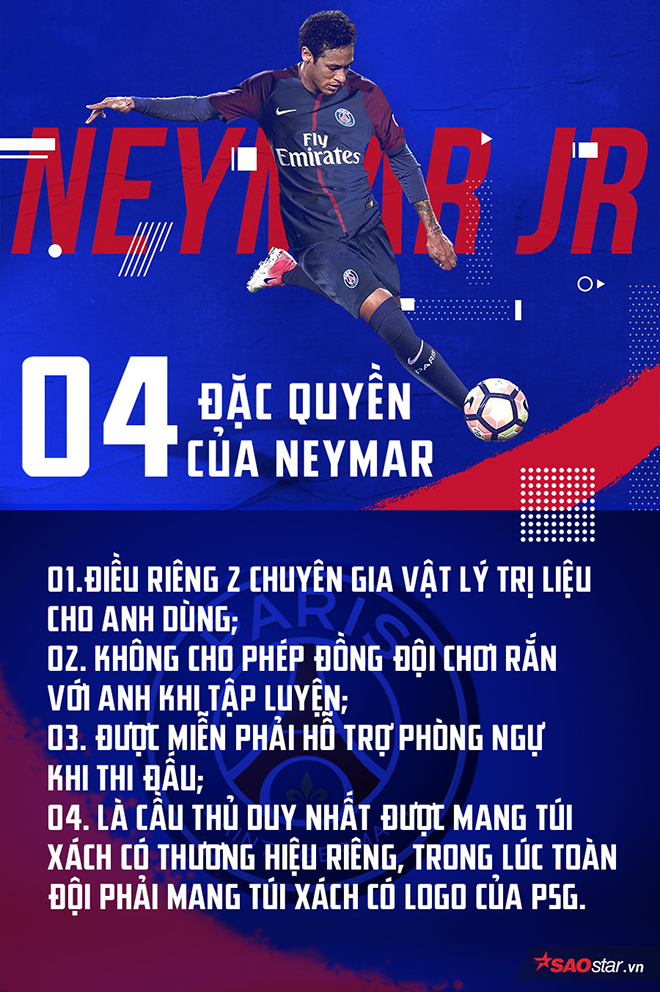 Nào ngờ đùng một cái, tân binh Neymar tới PSG lại có những hành động như kẻ kiêu ngạo tới mức biến thái. Không chỉ tranh quyền đá phạt đền với cựu binh Edinson Cavani, anh còn đề ra 4 yêu sách: 1. Điều riêng 2 chuyên gia vật lý trị liệu cho anh dùng; 2. Không cho phép đồng đội chơi rắn với anh khi tập luyện; 3. Được miễn phải hỗ trợ phòng ngự khi thi đấu; 4. Là cầu thủ duy nhất được mang túi xách có thương hiệu riêng, trong lúc toàn đội phải mang túi xách có logo của PSG.