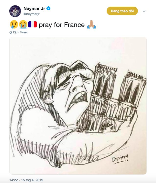 Tiền đạo Neymar hiện đang thi đấu cho CLB PSG chia sẻ một bức ảnh có chàng gù Quashimondo ôm lấy Nhà thờ Đức Bà Paris trên trang cá nhân kèm theo dòng chữ: “Cầu nguyện cho nước Pháp”. Bức ảnh mà Neymar đăng tải phần nào gây xúc động trong giới cầu thủ.