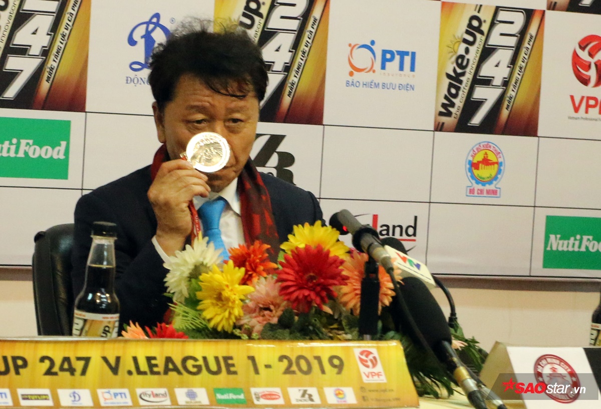 HLV Chung Hae Seong “khoe” HCB tại cuộc họp báo.