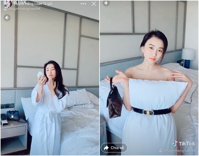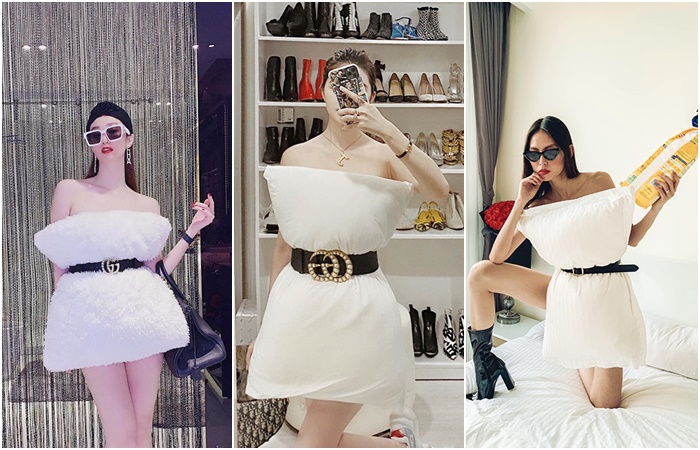 Trong thời gian vừa qua, NHM thích thú với những màn đu trend lấy gối làm váy của nhiều nghệ sĩ từ nghiêm túc tới lầy lội hài hước. Trong đó, người yêu Tiến Linh với thân hình chuẩn không cần chỉnh nên gia nhập hội đu trend nghiêm túc, nóng bỏng. Cô nàng còn kết hợp với trend biến hóa trên tiktok, thay đổi từ bộ đồ ngủ sang chiếc váy trắng được thiết kế chỉ từ một chiếc gối, kết hợp đi kèm là phụ kiện túi xách hàng hiệu càng thêm phần sang trọng.