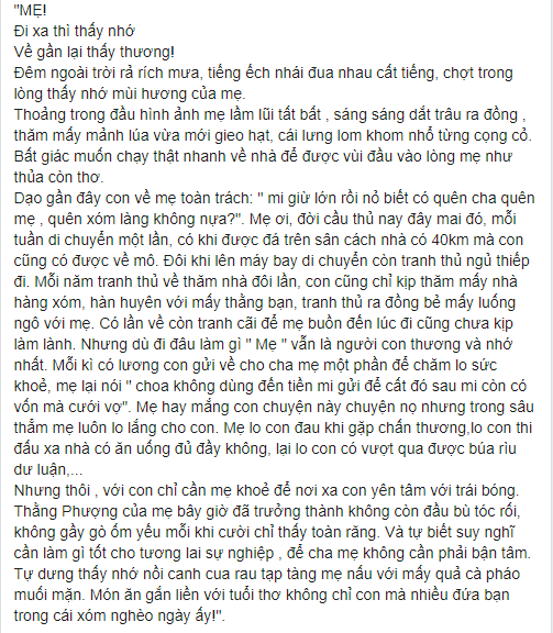 Dạo gần đây con về mẹ toàn trách: “Mi giừ lớn rồi nỏ biết có quên cha quên mẹ , quên xóm làng không nựa?”. Mẹ ơi, đời cầu thủ nay đây mai đó, mỗi tuần di chuyển một lần, có khi được đá trên sân cách nhà có 40km mà con cũng có được về mô. Đôi khi lên máy bay di chuyển còn tranh thủ ngủ thiếp đi. Mỗi năm tranh thủ về thăm nhà đôi lần, con cũng chỉ kịp thăm mấy nhà hàng xóm, hàn huyên với mấy thằng bạn, tranh thủ ra đồng bẻ mấy luống ngô với mẹ.